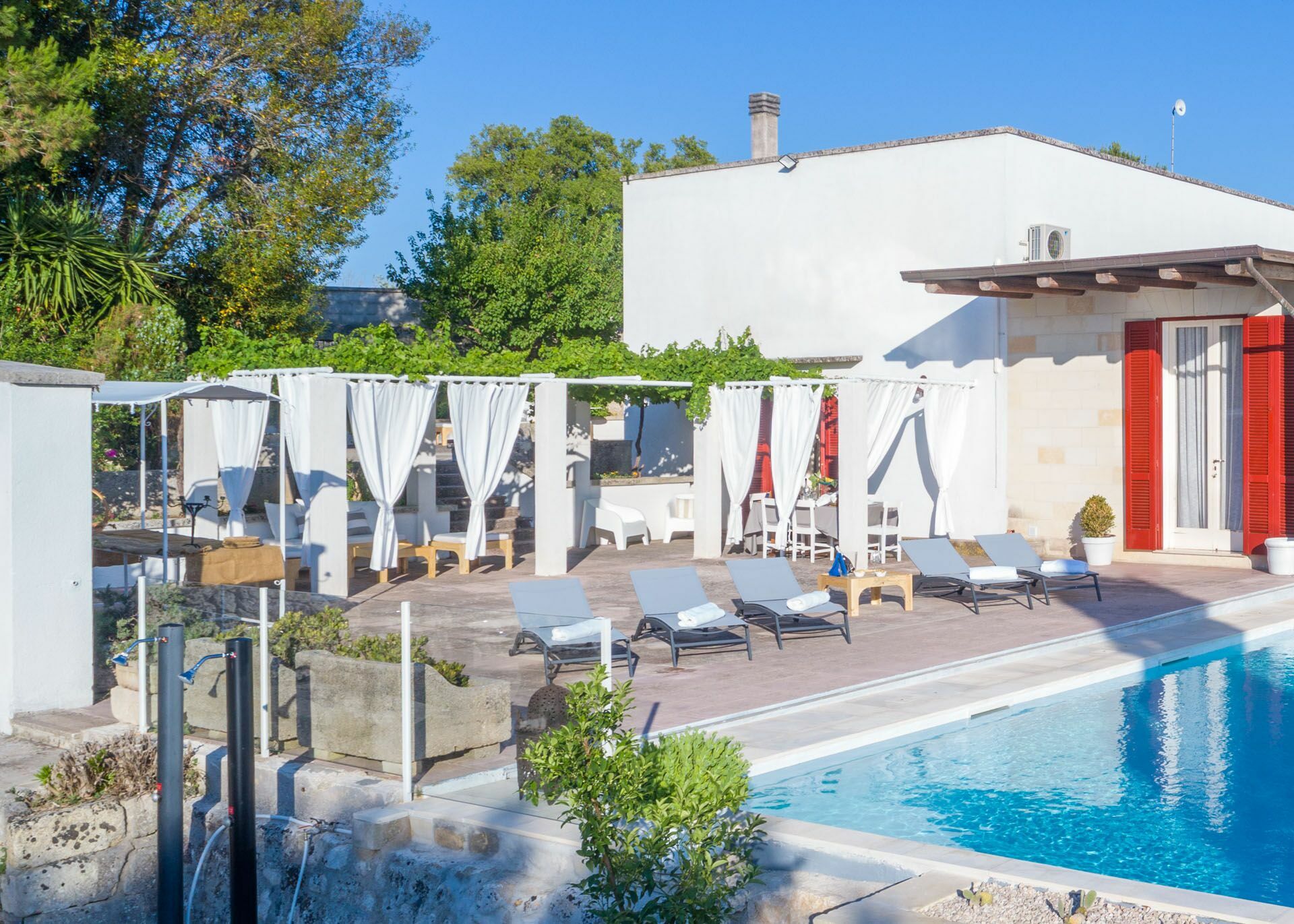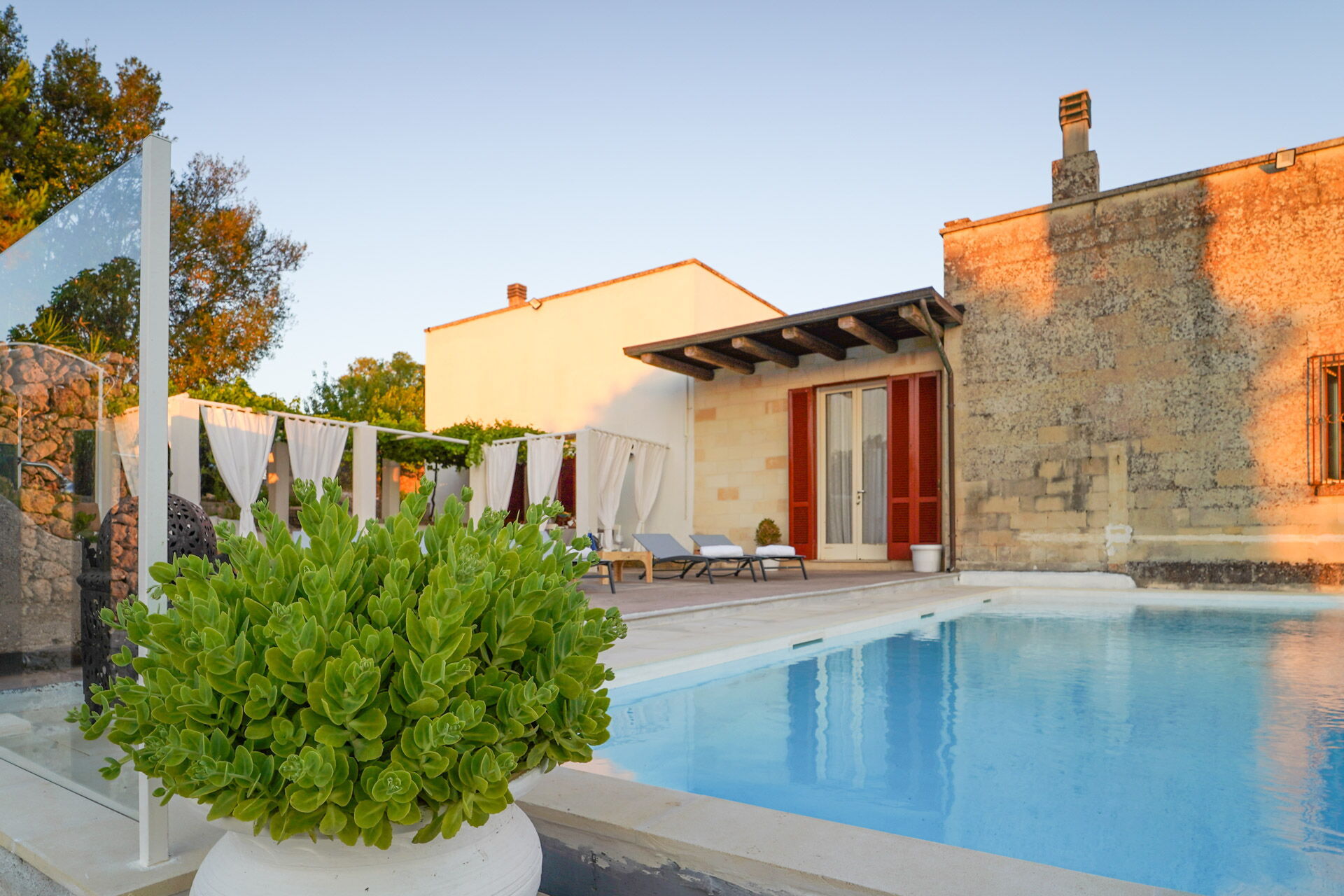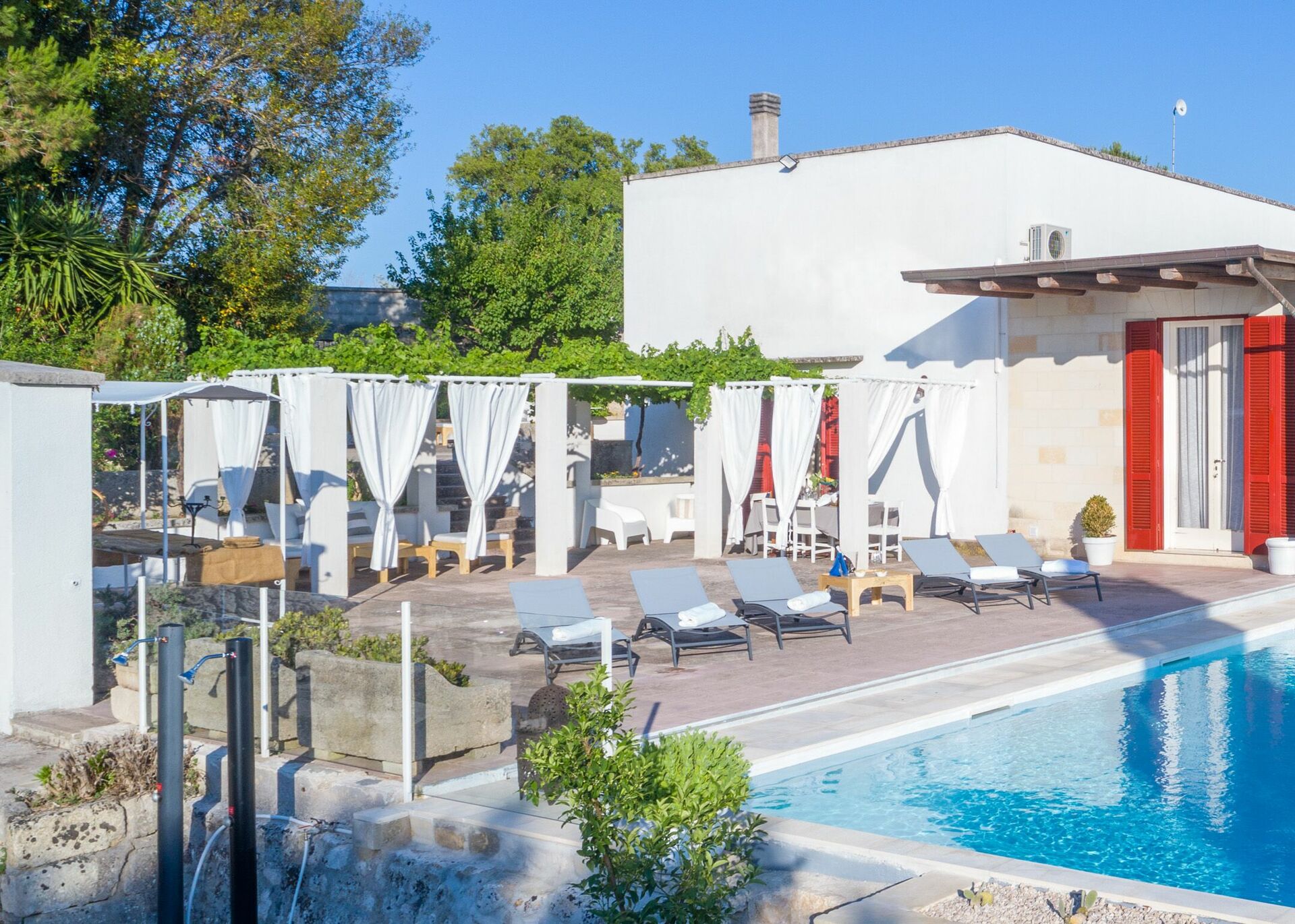 Affitto Casa Vacanze nel Salento, cinque ampie camere da letto con spaziosi sevizi, possono accogliere sino a dodici persone. Dispone di ingresso, soggiorno, sala da pranzo, sala colazione, cucina, bagno di servizio/lavanderia, giardino, solarium, piscina privata, circondata da un parco di circa dieci ettari, visita il sito per conoscere i dettagli.